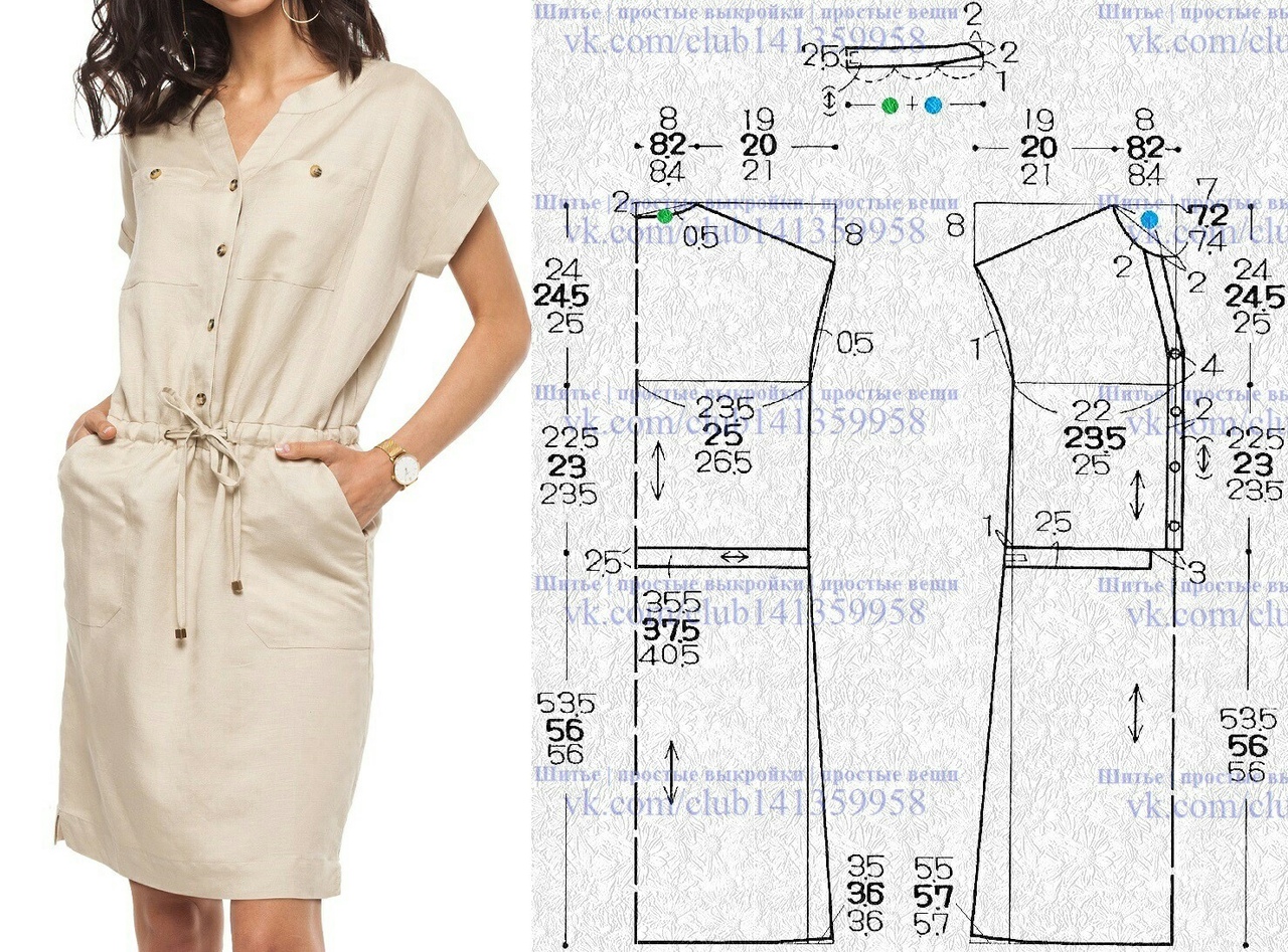 Платье с короткими цельнокроеными рукавами, застежкой и кулиской на талии. Выкройка на размеры 40/42, 44, 46/48 (рос.). #простыевыкройки #простыевещи #шитье #платье #выкройка