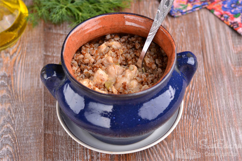 Гречка с курицей в горшочках. Готовим вкуснейшую гречку с курицей, репчатым луком, чесноком и майонезом в горшочках. Мясо измельчаем на небольшие кусочки, дополняем майонезом, репчатым луком и закладываем с гречкой в горшочки в сыром виде.