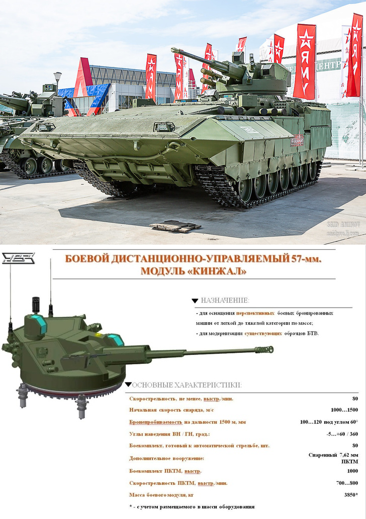2019 июнь. Тяжелая боевая машина пехоты Т-15 с боевым модулем "Кинжал". АО «Научно-производственная корпорация «Уралвагонзавод» демонстрируется опытный образец тяжелой боевой машины пехоты Т-15 («Объект 149») на перспективной универсальной гусеничной платформе «Армата» в исполнении с оснащением новым боевым дистанционно-управляемым модулем «Кинжал» с 57-мм автоматической пушкой