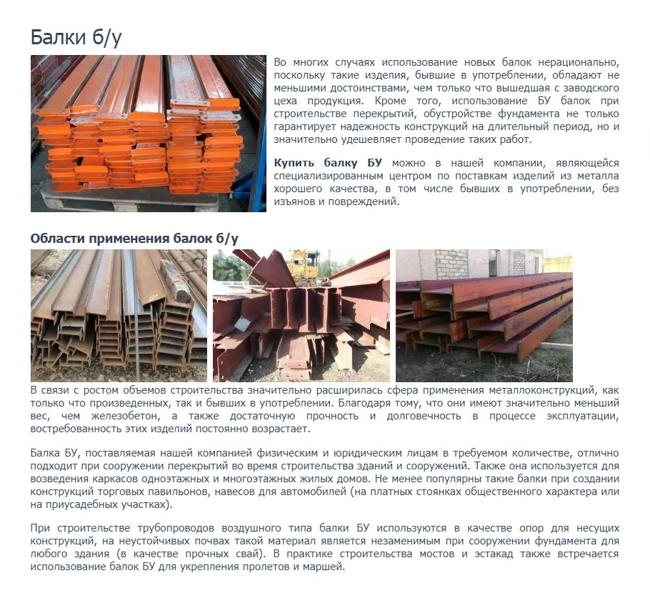 http://www.truba-mts.ru/balki-bu/ Балки б/у Во многих случаях использование новых балок нерационально, поскольку такие изделия, бывшие в употреблении, обладают не меньшими достоинствами, чем только что вышедшая с заводского цеха продукция. Кроме того, использование БУ балок при строительстве перекрытий, обустройстве фундамента не только гарантирует надежность конструкций на длительный период, но и значительно удешевляет проведение таких работ. Купить балку БУ можно в нашей компании