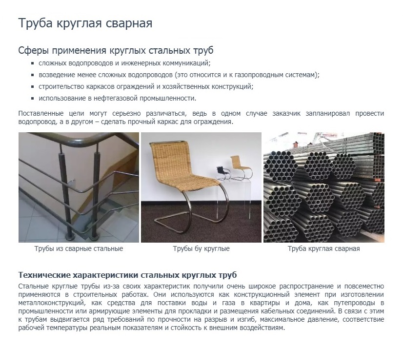 Они используются как конструкционный элемент при изготовлении металлоконструкций, как средства для поставки воды и газа в квартиры и дома, как путепроводы в промышленности или армирующие элементы.