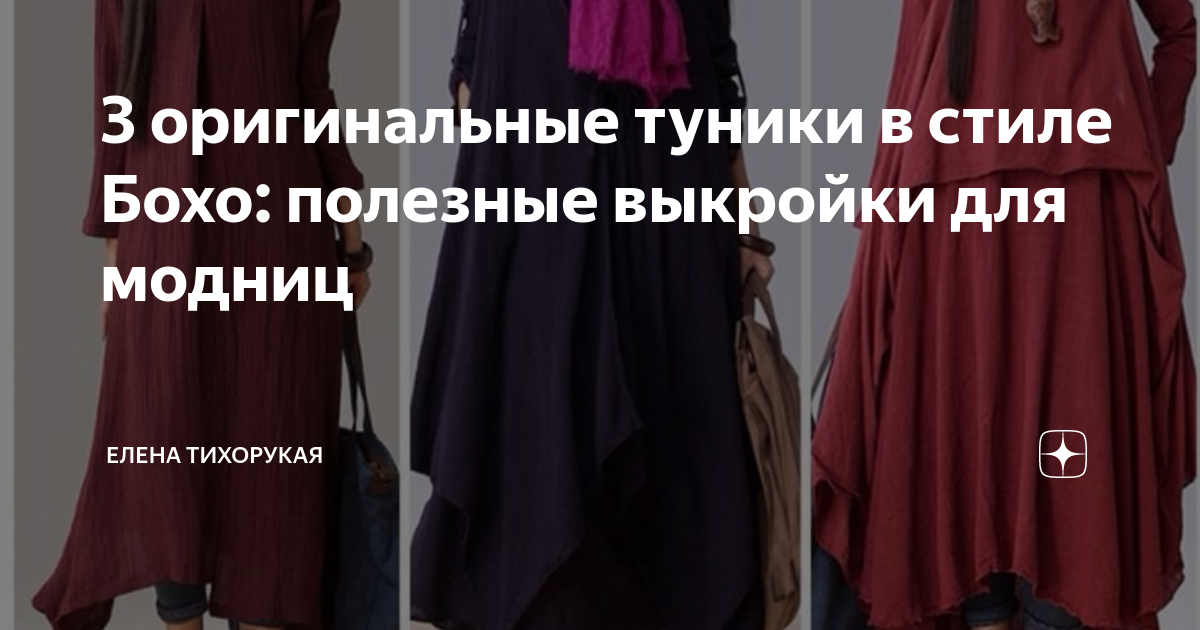 3 оригинальные туники в стиле Бохо: полезные выкройки для модниц Бохо-стиль невероятно популярен среди женщин. Представительницам прекрасного пола нравится свободная, оригинальная одежда. К тому же ее можно создать своими руками. Одним из самых распространенных предметов гардероба является туника. Легкая, свободная одежда, которую носят вместо блузки, рубашки и даже платья. На отлично смотрится с юбками, лосинами, брюками. К тому же ее легко сшить своими руками
