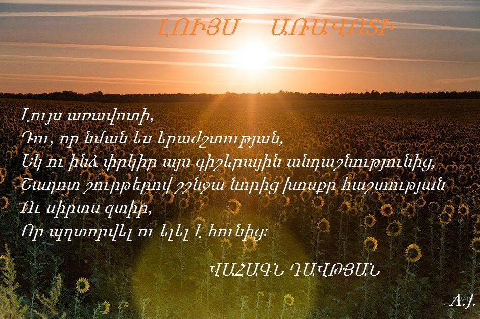 🌾🌿Լուսավոր օր եմ մաղթում 🌻🍀 ՎԱՀԱԳՆ ԴԱՎԹՅԱՆ |____ ԼՈՒՅՍ ԱՌԱՎՈՏԻ____ ********************************************************* Լույս առավոտի, Դու, որ նման ես երաժշտության, Եկ ու ինձ փրկիր այս գիշերային անդաշնությունից, Շաղոտ շուրթերով շշնջա նորից խոսքը հաշտության Ու սիրտս զտիր, Որ պղտորվել ու ելել է հունից: Ամբողջ գիշերը Ես նման էի մի մութ անձավի, Ուր կասկածների քամին էր հեծում, Կսկիծն էր զարթնել ինչ-որ մի անցած,մոռացված ցավի Ու մոլոր հավքի հուսահատությանբ պատերս էր ծեծում: