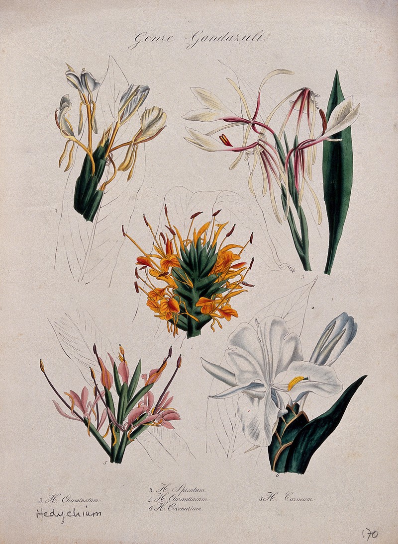 Пять видов имбирной лилии (видов гедихиума): цветущие стебли. Цветная литография.