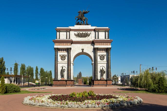 Триумфальную арку высотой 24 метра возвели в 2000 году. Арку венчает скульптура Георгия Победоносца, который поражает копьем змея. По четырем сторонам у подножия монумента располагаются скульптуры русских воинов разных эпох. На стенах арки — тексты о русском военном духе. / Мемориальный комплекс «Курская дуга»