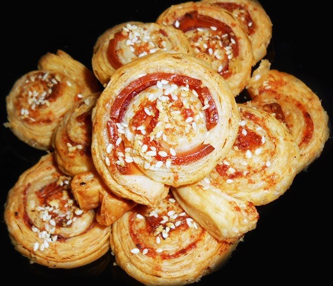 Простая и гениальная идея Слоеное тесто разморозить, немного раскатать, выложить по всей площади тонкие ломтики ветчины, сверху сыр, по желанию, можно тесто смазать кетчупом . Свернуть в рулет, нарезать на бочоночки толщиной 2-3 см, сверху посыпать приправой( если любите) или кунжутом. Отправить в разогретую до 180-200 градусов духовку на 20-30 минут( смотрите по готовности)