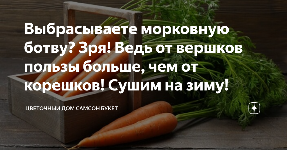 Выбрасываете морковную ботву? Зря! Ведь от вершков пользы больше, чем от корешков! Сушим на зиму! Морковь выращивается практически на каждом огороде или дачном участке. Не обходится без этого корнеплода приготовление первых блюд, разнообразных салатов, заготовок на зиму, да и просто морковный сок полезен и любим многими. Но далеко не многие знают о том, что морковная ботва превосходит по содержанию витаминов и микроэлементов корнеплоды и содержит ряд полезных веществ, которые в корнеплодах отс