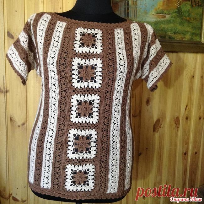 . Полосатая туника крючком с лентой из мотивов по центру Доброго дня СМ! Сегодня у меня еще одна свежесвязанная туника в полоску со спущенным рукавом. Перед и спинка оформлены полосой из квадратных мотивов. С этой полосы и было начало вязания модели.