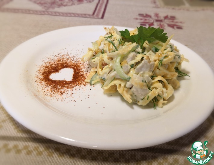 - Перед подачей всё смешиваем и украшаем по вашему вкусу (сегодня у меня петрушка и сердечко из молотой паприки))). Если всё смешать заранее, то огурцы дадут сок и салат станет более жидким - кому-то так даже больше нравится.