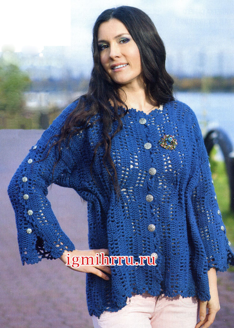 Синяя ажурная кофточка с металлическими пуговицами. Вязание крючком