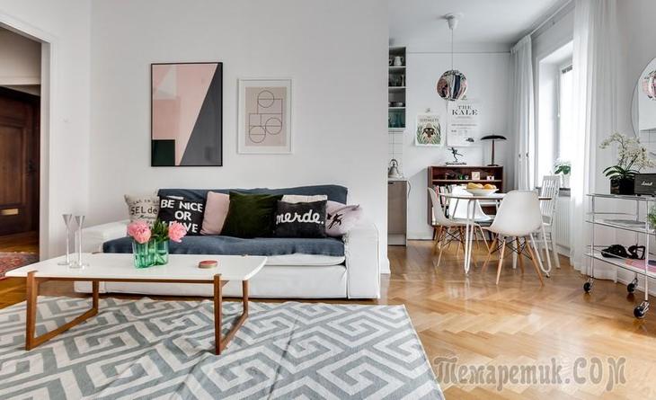 Шведская студия в 61 м² Небольшая скандинавская квартира, шарм которой придают ретромебель и винтажный ковер. Кухня отделена от гостиной функциональной перегородкой. Цветовые акценты этой студии — серый, розовый и темно-зеле...