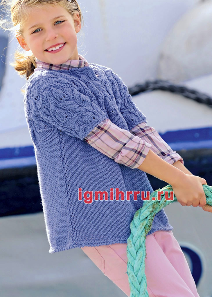 Для девочки 2-8 лет. Туника с рельефным узором «косы листочками». Вязание спицами для детей. Вязание спицами для девочек