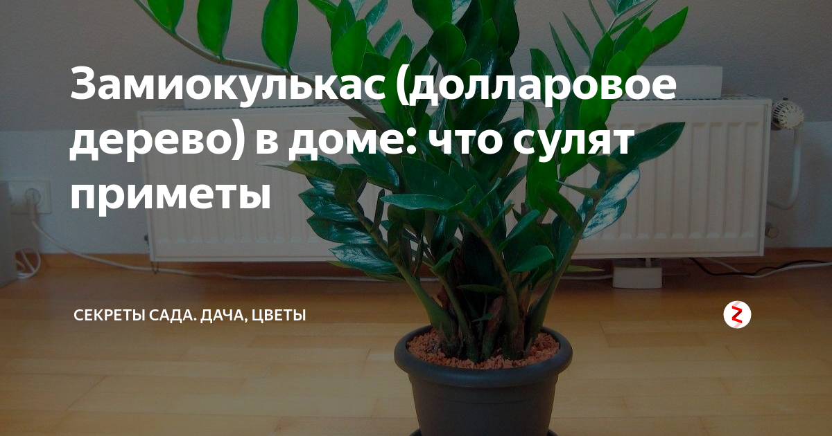 Замиокулькас (долларовое дерево) в доме: что сулят приметы Народные поверья сложились вокруг каждого цветка, украшающего наши дома. Кто-то прислушивается, другие — скептически ухмыляются. Сегодня я расскажу, какую славу завоевал замиокулькас — декоративно-лиственный цветок с изумрудной зеленью. Подчёркиваю: статья носит лишь описательный характер и нисколько не претендует на достоверность.