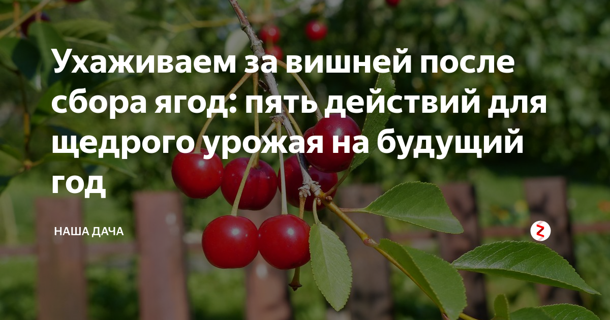 Ухаживаем за вишней после сбора ягод: пять действий для щедрого урожая на будущий год Многие дачники почему-то не считают нужным ухаживать за деревьями после сбора урожая, а, между тем, зря. За время, пока вишня цвела, наливалась плодами и зрела, почва под деревьями успела истощиться. Если хотите получать хорошие урожаи и впредь – не поленитесь и поухаживайте за вашим вишневым садом, тем более, что по времени это занимает пару часов.