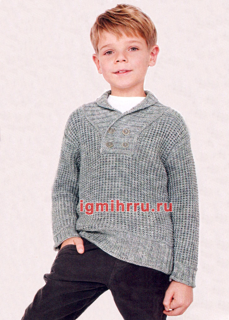 Для мальчика 5-11 лет. Серый джемпер с шалевым воротником-поло. Вязание спицами для детей