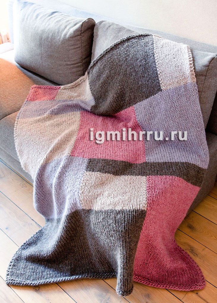 Цветное шерстяное покрывало крупной вязки. Вязание спицами