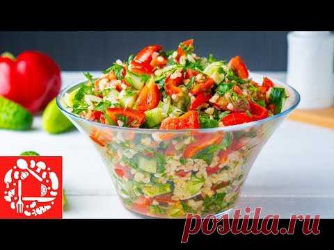 Салат с булгуром помидоры - 250 г огурцы - 250 г перец сладкий - 2 шт. булгур - 1/2 ст. лук - 1/2 шт. петрушка - пучок укроп - пучок лимон - 1/2 шт. масло оливковое - 3-4 ст. л.
