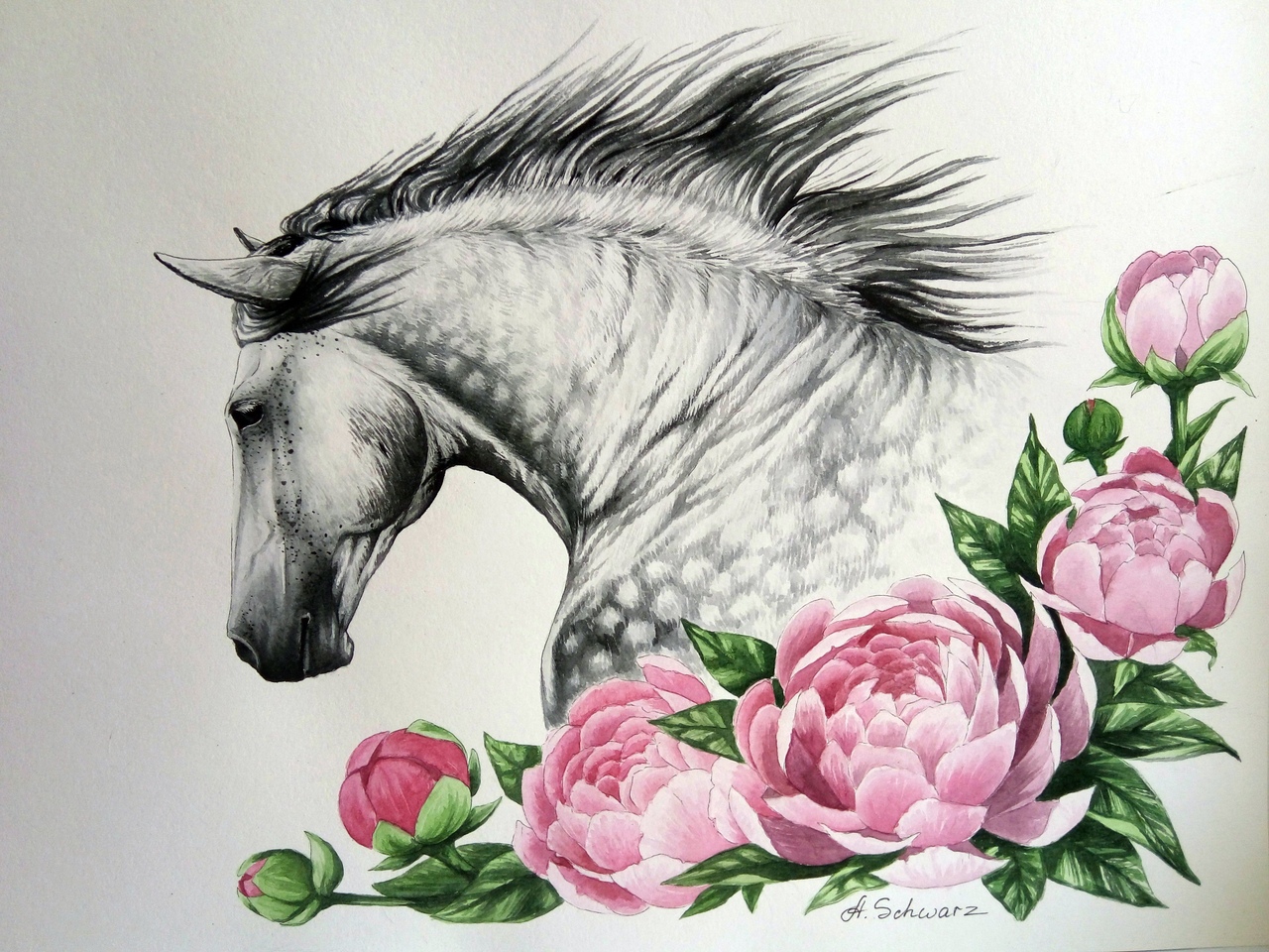Лошадка с пионами. Рисунок Анжелики Шварц https://vk.com/lika_schwarz_art
