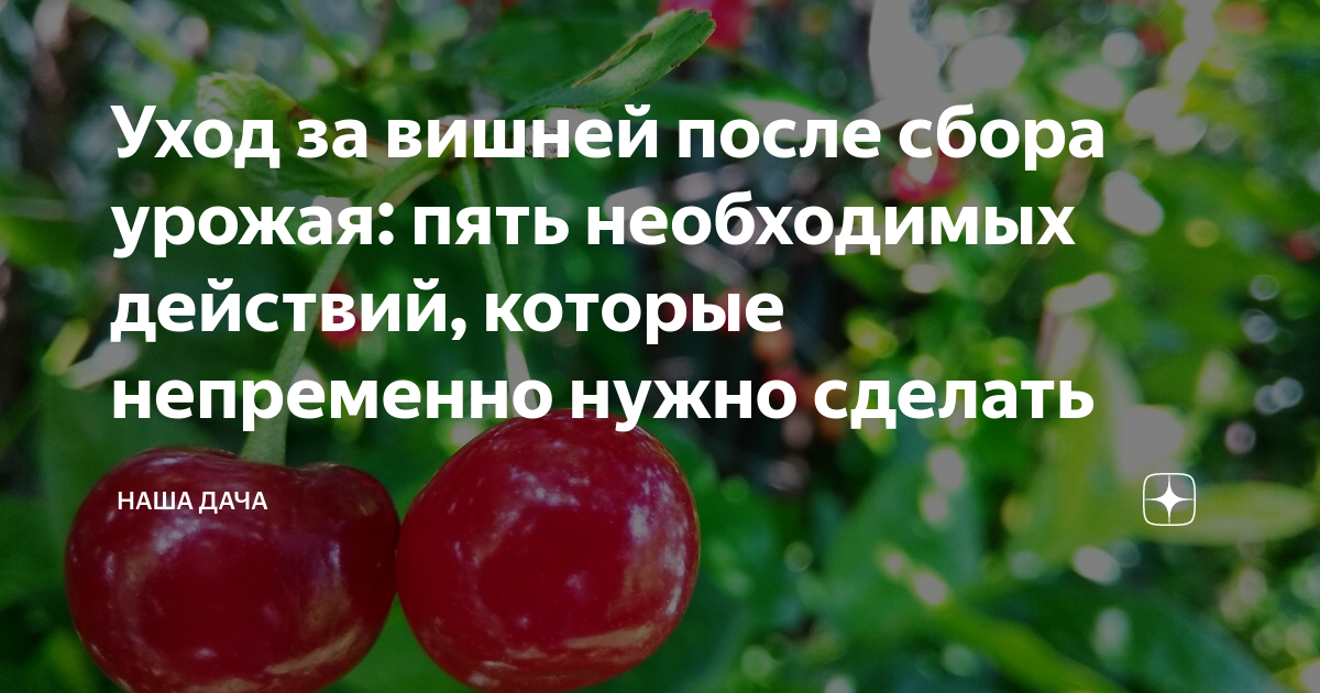 Уход за вишней после сбора урожая: пять необходимых действий, которые непременно нужно сделать Если хотите и на будущий год собрать много ягод, конечно. На сегодняшний день все плоды уже собраны. Но будет ошибкой считать, будто бы вишневые деревья не нуждаются в уходе после сбора урожая. За время, пока вишня цветочки набирала, завязывалась и спела, земля под кустами уже успела истощиться. Так что не поленитесь и поухаживайте за вашим садиком – и на будущий год вишня вас отблагодарит.