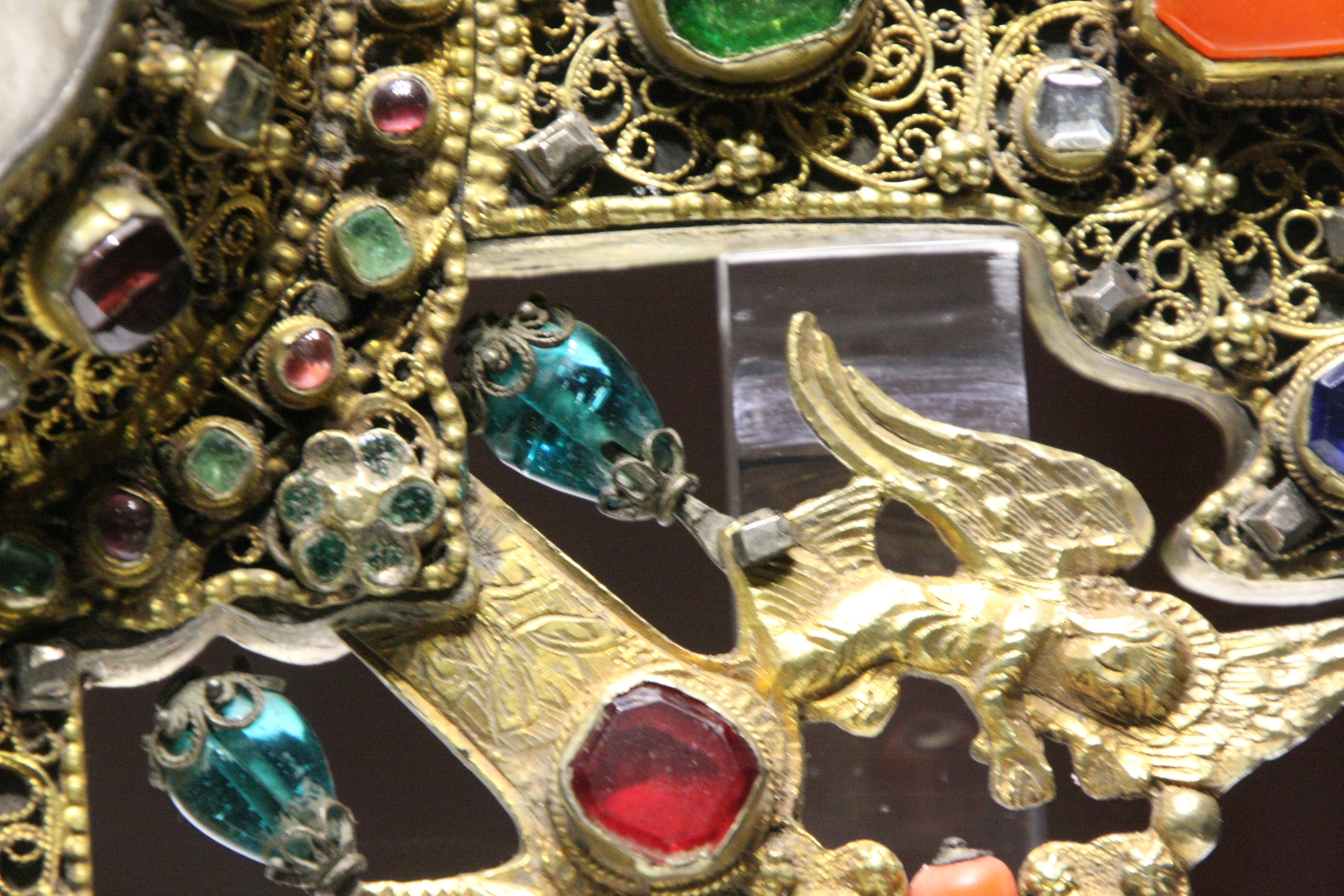 Крест с мощами Святого Георгия Победоносца. Западная Армения, Ван (Васпуракан). 1746 год. Серебро, сердолик, кораллы, изумруды-кабошоны, цветные камни, стекло; золочение. Христианство пришло в Великую Армению во второй половине I века н.э. Святое Евангелие в древней армянской земле проповедовали двое из двенадцати апостолов Иисуса Христа В I-IV столетиях в Великой Армении царями и князьями-язычниками было убито множество христиан,имена которых включены в четьи-минеи и праздничный календарь