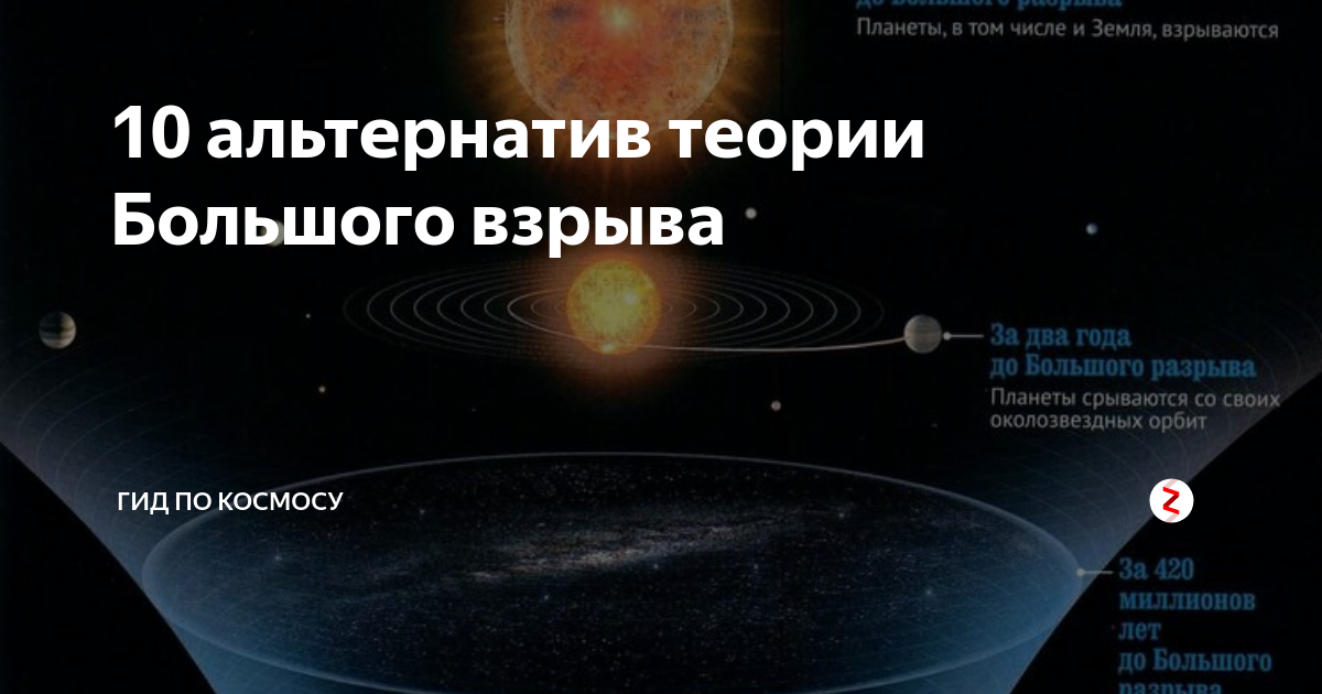 10 альтернатив теории Большого взрыва 1. Теория стационарной Вселенной В начале было два "слова". Первое описывало Большой Взрыв, отсутствие времени и сингулярность - точку с бесконечной концентрацией вещества. Второе отрицало "начало времён". Оно называлось "теорией стационарной Вселенной" и постулировало, что космос существовал всегда. Со временем, после получения некоторого количества подтверждений, теория Большого взрыва взяла...