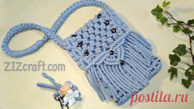 DIY Сумочка для телефона своими руками. Макраме сумка - Стильное макраме. Сумка - клатч в технике макраме. Модная прямоугольная макраме сумочка сплетена из трикотажной пряжи. В эту маленькую сумку через плечо помещается и мобильный и косметика и даже блокнотик. Оригинальная идея для подарка подруге на день рождения . Для плетения этой сумки я использовала 4 вида популярных узлов макраме. Для создания этой сумочки Вам понадобится 1,5 часа времени и около 70 м нитей (пряжи) 4-5 мм.