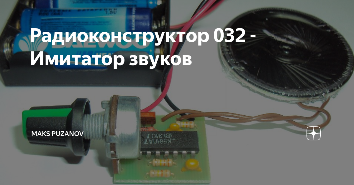 Радиоконструктор 032 - Имитатор звуков Вариант №32 "Имитатор звуков". Конструкция на одной микросхеме К561ЛА7. В составе: микросхема, транзистор кт361, динамик, элементы питания, схема и описание. Собранная схема позволяет имитировать различные звуки и голоса животного мира. Вашему вниманию представляется простая схема имитатора звуков на микросхеме К561ЛА7. С помощью этой схемы можно воспроизводить разные звуки, похожие на пение пт