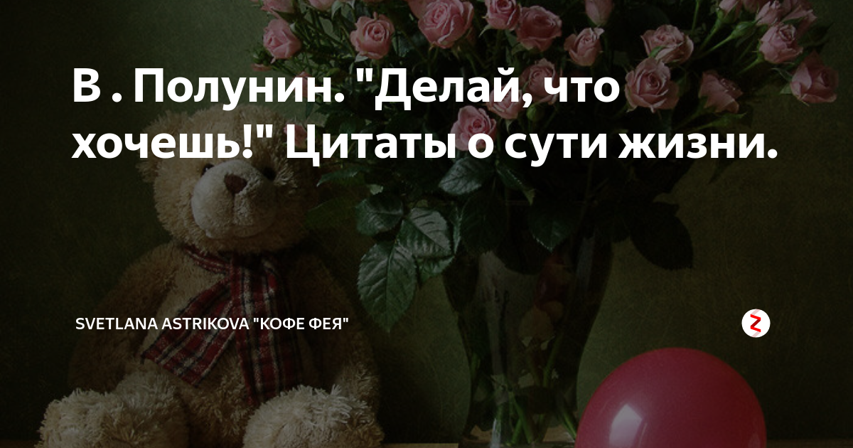 В . Полунин. "Делай, что хочешь!" Цитаты о сути жизни. Советы и мысли от Вячеслава Полунина 1. Занимайся только тем, от чего внутри дзинькает. 2. Что хош, то и делай, не хош не делай. 3. Общайся только с теми, кого хочется обнять.
