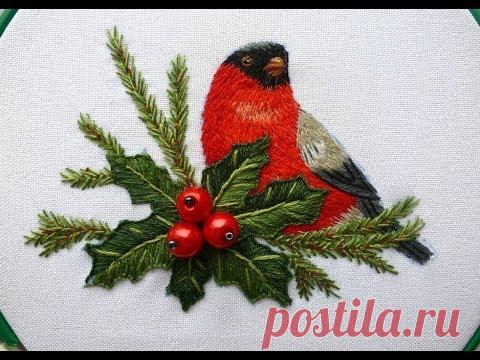 Рождественская вышивка гладью: "Снегирь и остролист". Часть 1