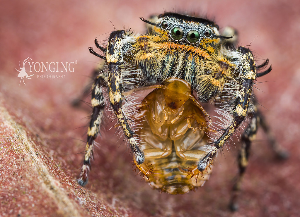 Male Phidippus comatus First Test on MPE+M43 (Single Frame | F9 | ISO100 | S1/250 | 2x Magnification) Body: Olympus OM-D E-M1 Mark1 Lens: Canon MP-E 65mm f/2.8 1-5x Adapter: Metabones T-Smart Adapter (Canon EF to MFT) Flash: Kuangren Macro Twinlite KX-800 Diffusion: 2 layers of polyfoam mounted in front of lens via a bundle of step-up & step-down rings