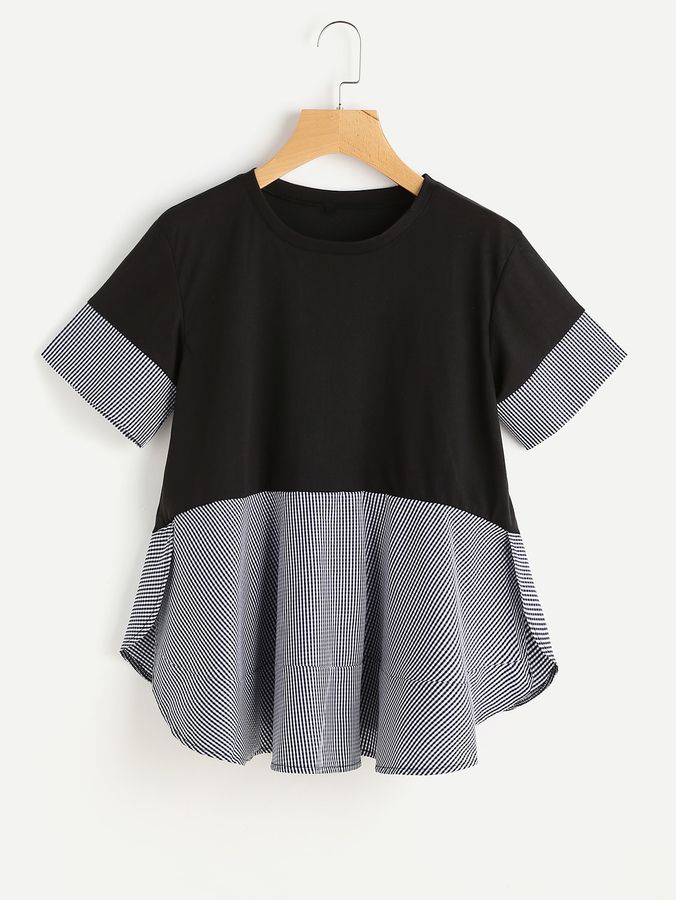 Shein Contrast Gingham Slit Side Curved Hem Tee