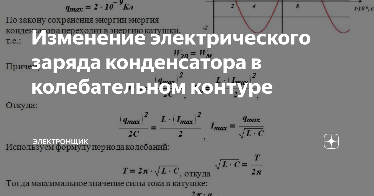 Изменение электрического заряда конденсатора в колебательном контуре Одной из самых важных частей радиопередатчика или радиоприёмника можно считать колебательный контур, который отвечает за возбуждение электрических колебаний (другое название переменных токов высокой частоты). Колебательный контур является замкнутой цепью, состоящей из электрического конденсатора, катушки индуктивности и источника питания.