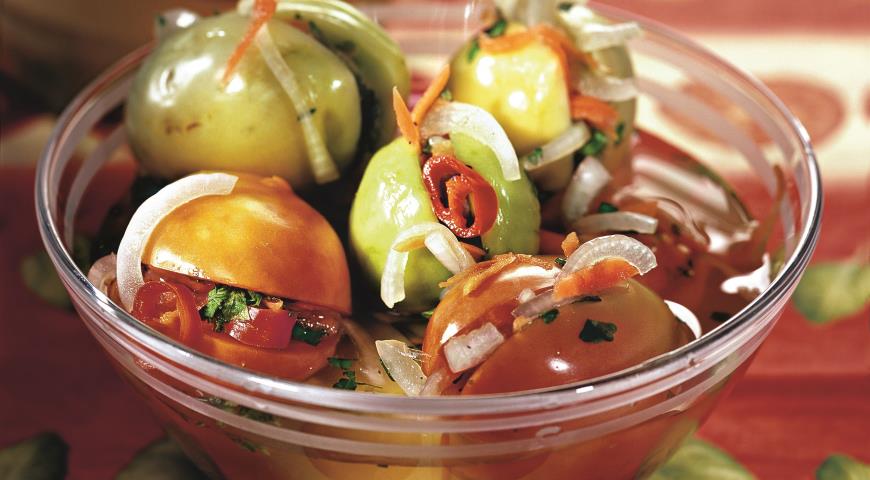 - Зеленые помидоры вымойте, на каждом сделайте глубокий надрез. Поместите в него приготовленную ранее начинку из овощей. Плотно уложите в кадку или другую емкость подходящего объема.