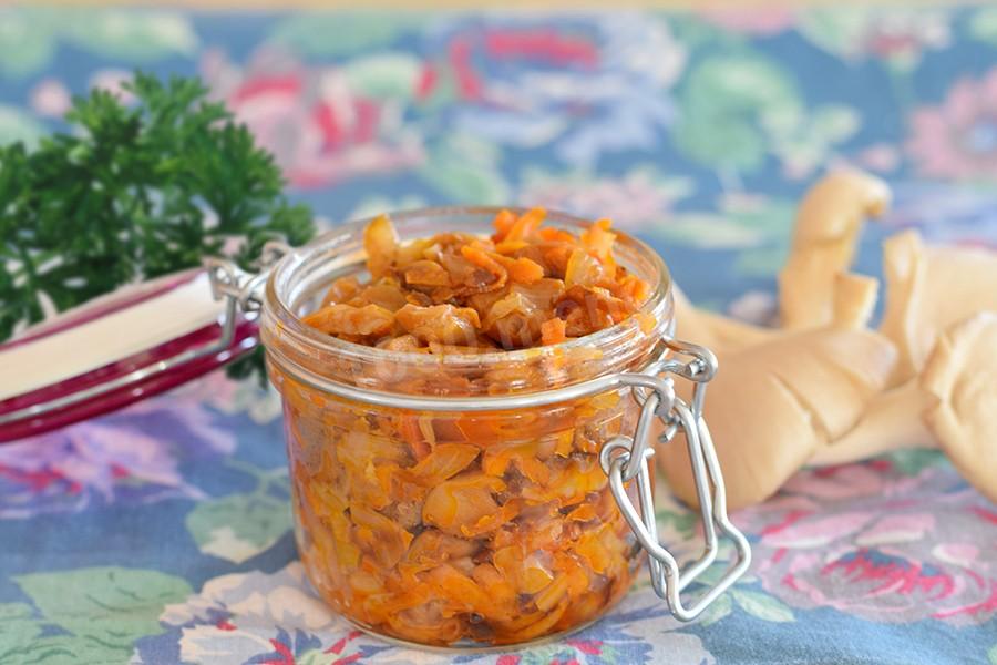 - 1. Морковь очищаем, с капусты снимаем верхние листья, шинкуем не слишком крупно. Болгарский перец очищаем от семян и перегородок, моем, режем кубиками не крупно. 2. Обжариваем овощи на растительном масле в течение 10 минут (масла используем половину порции). 3. Репчатый лук очищаем, нарезаем кубиками вместе с предварительно вымытыми вешенками. 4. В кипящей подсоленной воде отвариваем грибы в течение 7 минут, затем отбрасываем их на дуршлаг, чтобы стекла лишняя жидкость. 5. Обжариваем вешенки с луком на оставшемся растительном масле до прозрачности лука, это займет примерно 5 минут. 6. Соединяем обжаренные овощи с грибами, насыпаем сахар и соль, добавляем лавровый лист и душистый перец горошком, а также томатную пасту. Перемешиваем ингредиенты, доливаем немного воды и тушим солянку в течение получаса под закрытой крышкой. 7. По истечении указанного времени наливаем уксус, даем покипеть 3-4 минуты и раскладываем по предварительно простерилизованным банкам. Закрываем заготовки герметично, храним в прохладном месте. Вдохновения вам и вкусных заготовок!