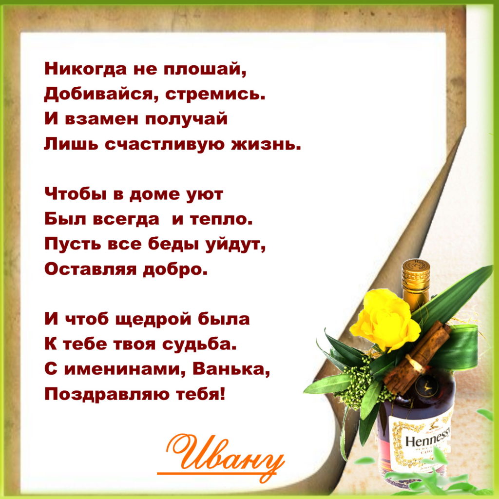 Именины Ивана - Поздравься Никогда не плошай, Добивайся, стремись. И взамен получай Лишь счастливую жизнь. Чтобы в доме уют Был всегда и тепло. Пусть все беды уйдут, Оставляя добро. И чтоб щедрой была К тебе твоя судьба, С именинами, Ванька, Поздравляю тебя!