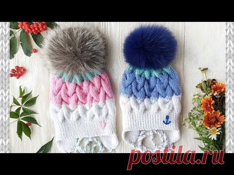 Вязаная шапка с объемными косами. Шапочка для детей. Шапка спицами.