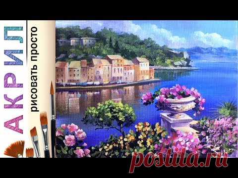«Город на море. Веранда и цветы» как нарисовать пейзаж 🎨АКРИЛ! Мастер-класс ДЕМО