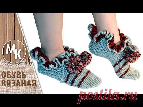 Простые вязаные тапки крючком с рюшами и бомбошками, вязание крючком для начинающих, помпоны. - YouTube