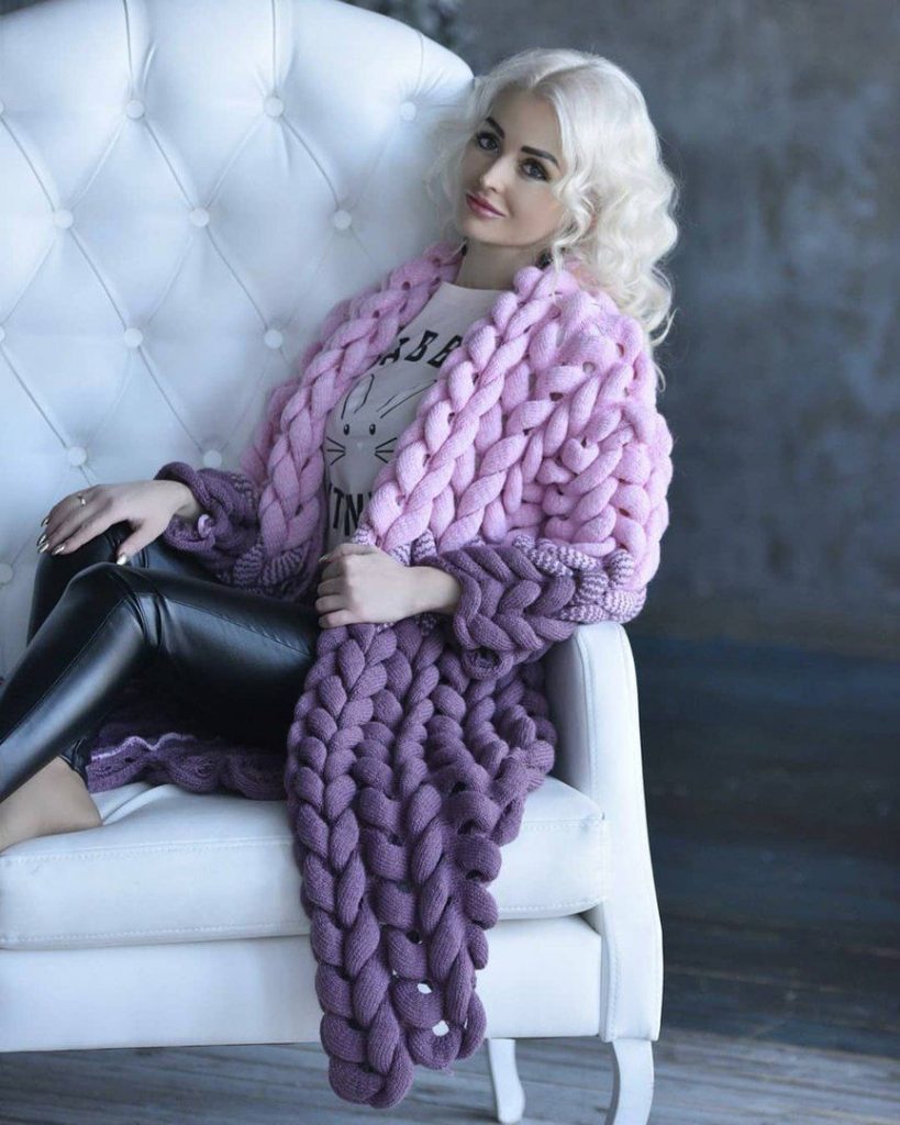 Предлагаю вам связать вот такой замечательный теплый кардиган, который нарекли незамысловатым названием «Шиншилла». Он действительно похож на этого зверька, благодаря волнам, которые создает узор азиатский колосок. Кардиган, связанный узором азиатский колосок, стал настоящим хитом среди модниц.