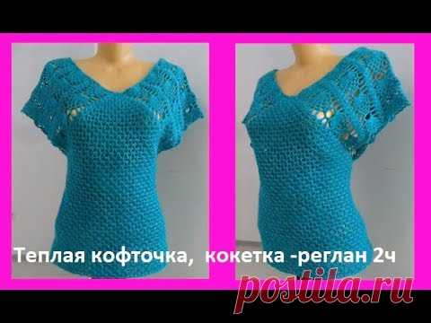 Теплая кофточка"Бирюза" с самой простой кокеткой- реглан,вязание крючком,( В №166)