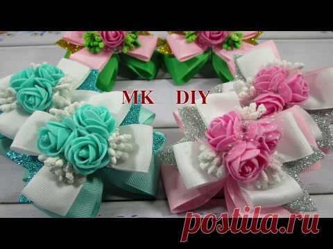 Бантики с розами из репсовых лент и глиттерного фоамирана своими руками