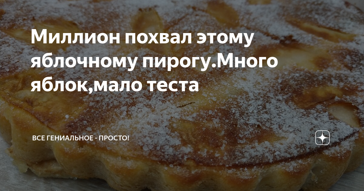 Миллион похвал этому яблочному пирогу.Много яблок,мало теста Мы Вас знакомим еще с одним рецептом "Яблочного пирога".В этом пироге много яблок и практически нет теста.Пожалуй, яблоки являются самой популярной начинкой для пирогов.Для более насыщенного аромата в пирог можно добавлять ваниль, корицу, мускатный орех, гвоздику, апельсиновую или лимонную цедру.Делайте все как вы любите....