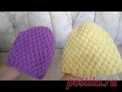 Видео-обзор моих бесшовных шапочек, связанных спицами по кругу узором вафельки