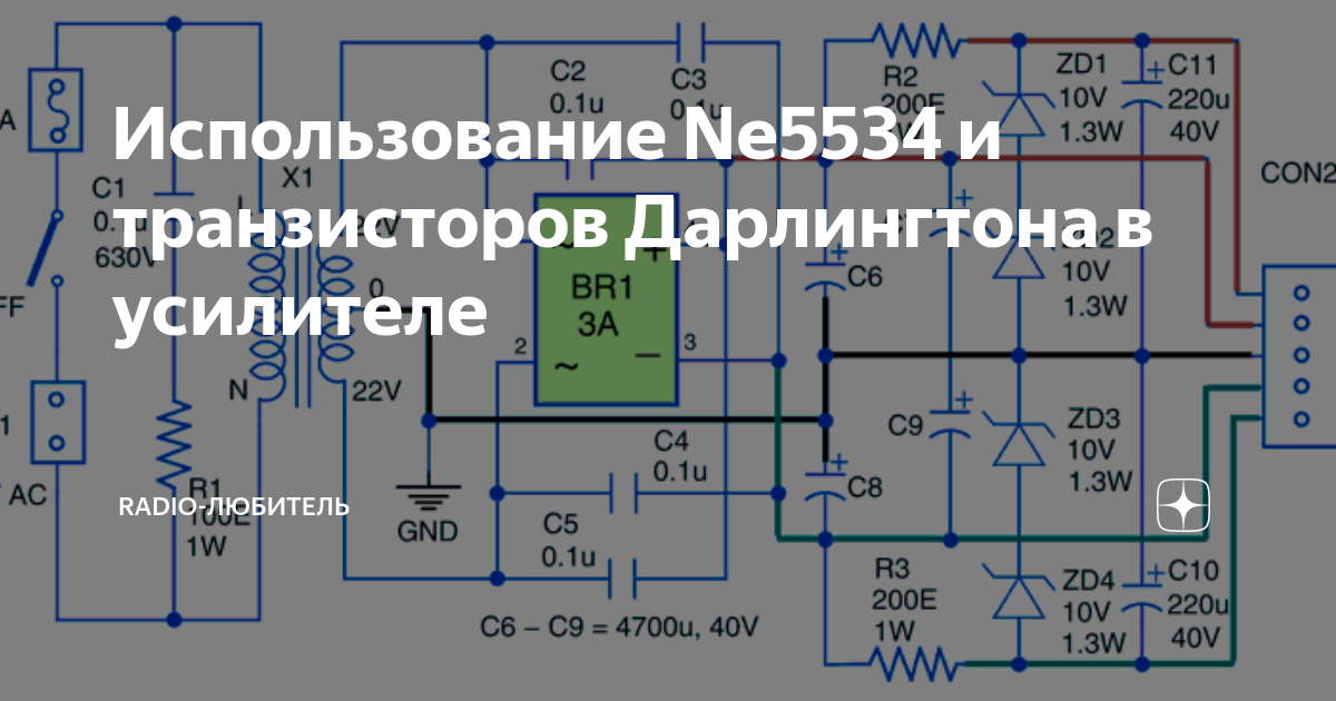 Использование Ne5534 и транзисторов Дарлингтона в усилителе Существует множество различных схем усилителей мощности звука, но разработка усилителя мощности с использованием операционного усилителя и биполярных транзисторов весьма заманчива. По сравнению с микросхемами силовые транзисторы легко заменить в случае неисправности и имеют: