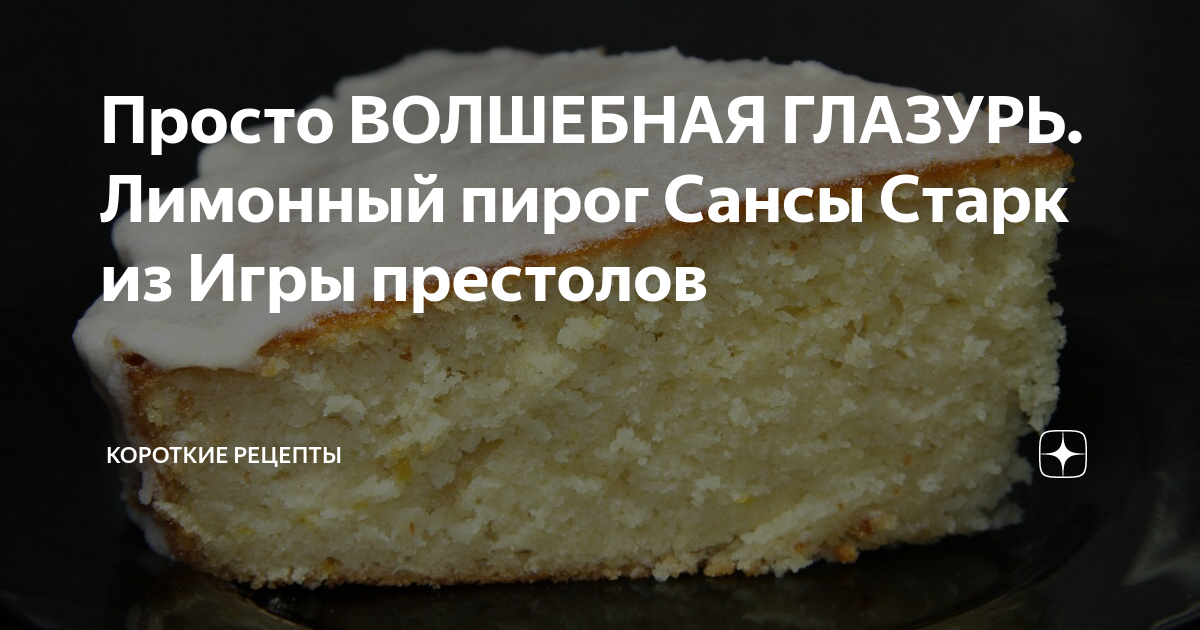 Просто ВОЛШЕБНАЯ ГЛАЗУРЬ. Лимонный пирог Сансы Старк из Игры престолов Этот рецепт можно найти в книге "Пир льда и огня". И хотя авторы назвали свое творение печеньем, оно гораздо больше похоже на лимонный пирог. Именно его ела Санса Старк в Красном замке. Ингредиенты. Тесто: 200 грамм сливочного масла;