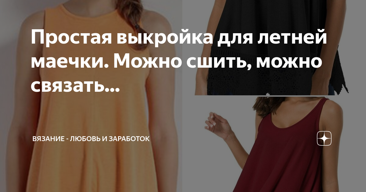 Простая выкройка для летней маечки. Можно сшить, можно связать... Летом, когда можно ходить не прячась в сто одёжек, особенно хочется чего-то яркого, красивого и удобного. Независимо от комплекции и типа фигуры, хочется одеваться и выглядеть элегантно женщинам и девушкам в любом возрасте. И, если Вы умеете вязать или шить, то сделать это намного проще. И, даже если, Вы ещё только начинаете вязать, то летние наряды создать Вам вполне по силам. Умеете вязать крючк