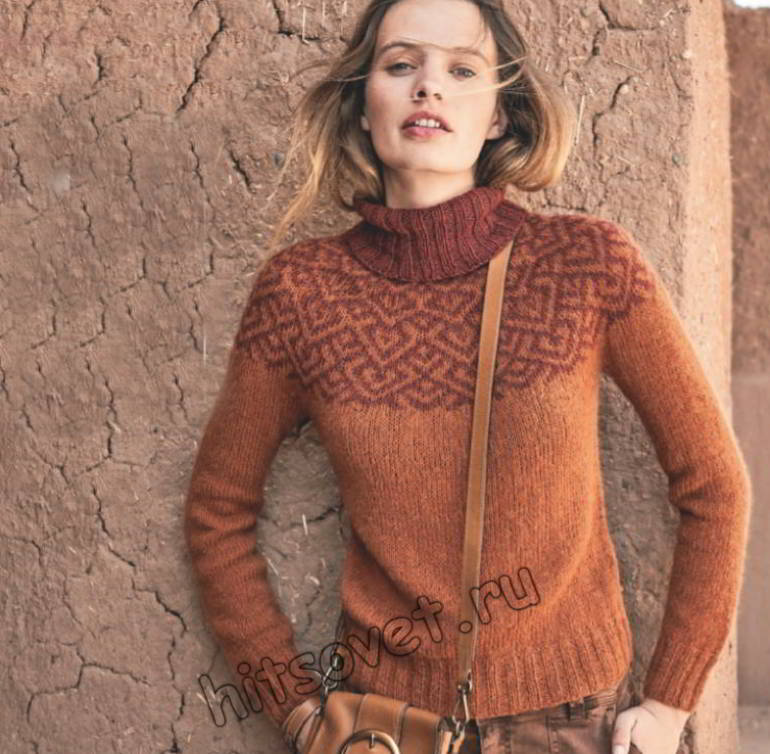 Вязаный свитер с круглой жаккардовой кокеткой - Хитсовет Модная модель женского вязаного свитера с круглой жаккардовой кокеткой со схемой и пошаговым бесплатным описанием вязания.