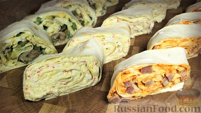 Рецепт: Рулетики из лаваша (три варианта: с колбасой, шпротами и крабовыми палочками) на RussianFood.com