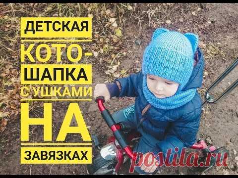 Детская котошапка с ушками спицами на завязках Как вязать детскую шапочку Вяжем шапку с ушами
