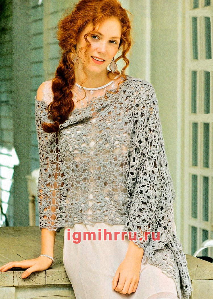 Изящный серый палантин из квадратных мотивов. Вязание крючком со схемами и описанием